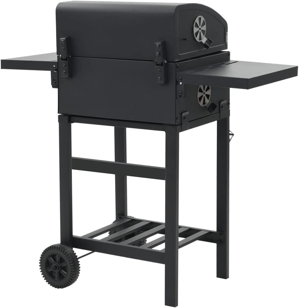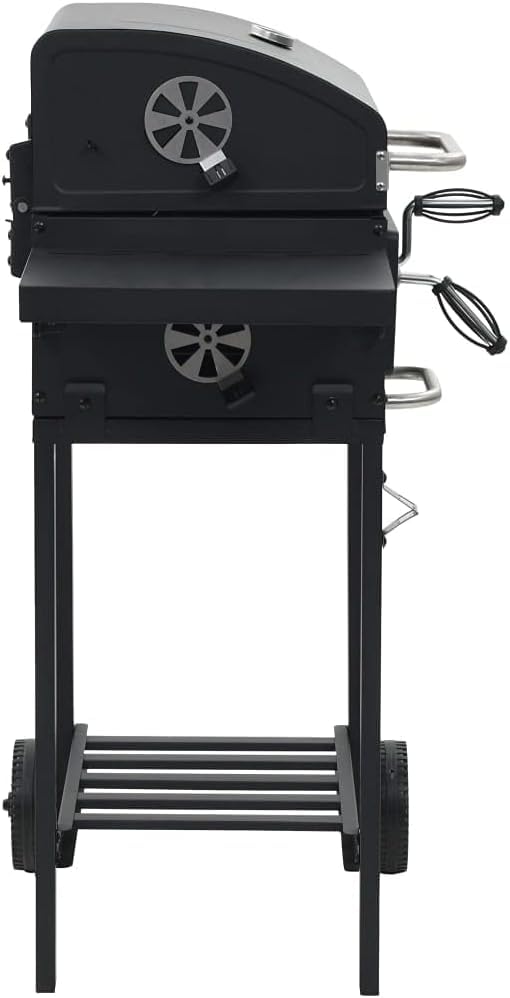 Charcoal-Fueled BBQ Grill with Bottom Shelf Black-Home & Garden Kitchen & Dining Kitchen Appliances Outdoor Grills. Descriptiong: This heavy-duty charcoal-fueled BBQ grill is ideal for creating an outdoor feast for your family and friends. It will make your outdoor cooking experience sizzle, effectively turning your backyard into a second kitchen! Using charcoal as fuel, this barbecue grill is suitable for grilling, broiling and smoking. You can monitor the temperature in the chamber with the integrated thermometer on the hood. Thanks to the powder-coated steel body, our barbecue grill has a sleek and stylish design and is very . It has 2 pieces of enamelled cooking grid and a heavy-duty hood. Two foldable side tables offer additional space for creating sauces or your favourite side dishes. Equipped with 2 castors, this grill is easy to move around. This barbecue grill will surely be an indispensable part for your outdoor activities!